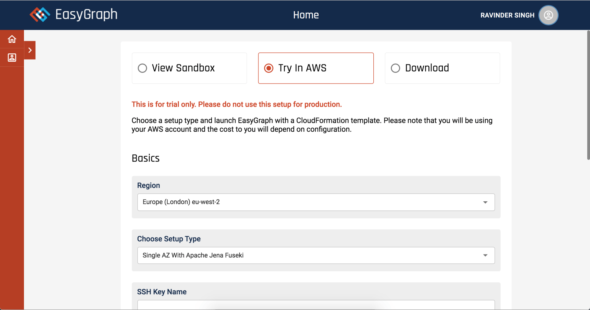 It is very easy to try EasyGraph. Just visit the EasyGraph Trial signup where you have multiple options as to how to get going. We have now added an option to lauch EasyGraph in the AWS cloud. Just select the appropriate option from "Choose Setup Type", enter a few more details and click the LAUNCH STACK button.