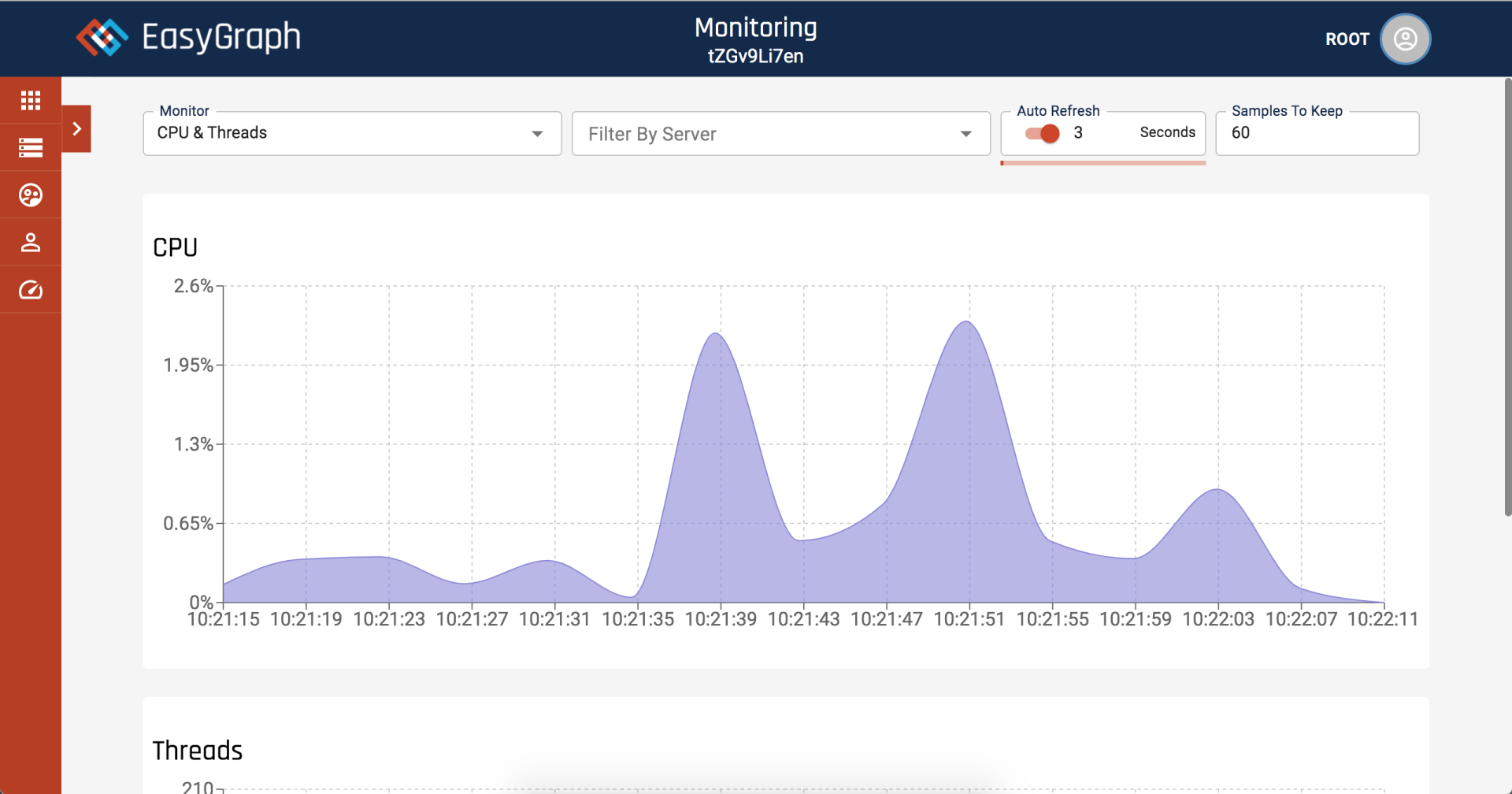 You can now monitor an EasyGraph instance from the UI. You can get a real time view of CPU use, threads, API requests and JVM memory usage.