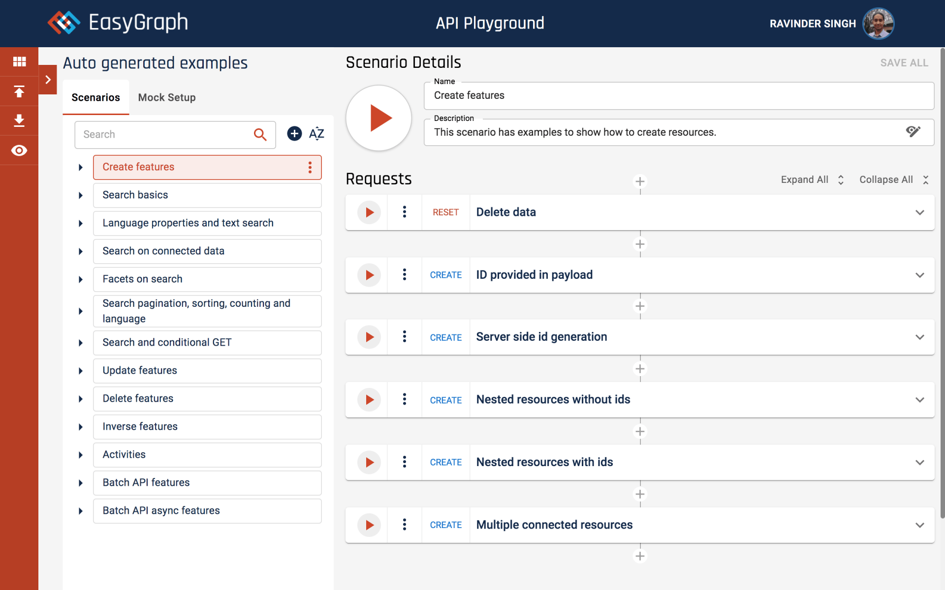 The playground is fully integrated in to EasyGraph and provides the means to create multiple workspaces, where each workspace consists of scenarios (tasks) that a developer wants to achieve. Each scenario consists of various API requests over which a developer has full control.