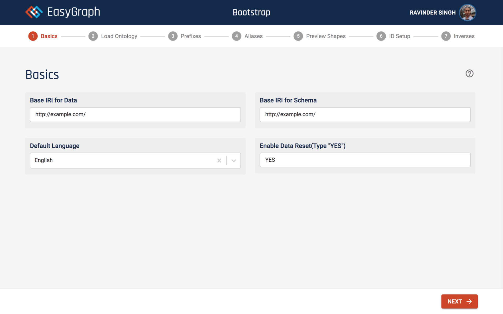 Enter ' http://example.com/ ' in the base IRIs fields. Enter 'YES' for 'Enable Data Reset'. For the language option leave the default. Click the Next button.
