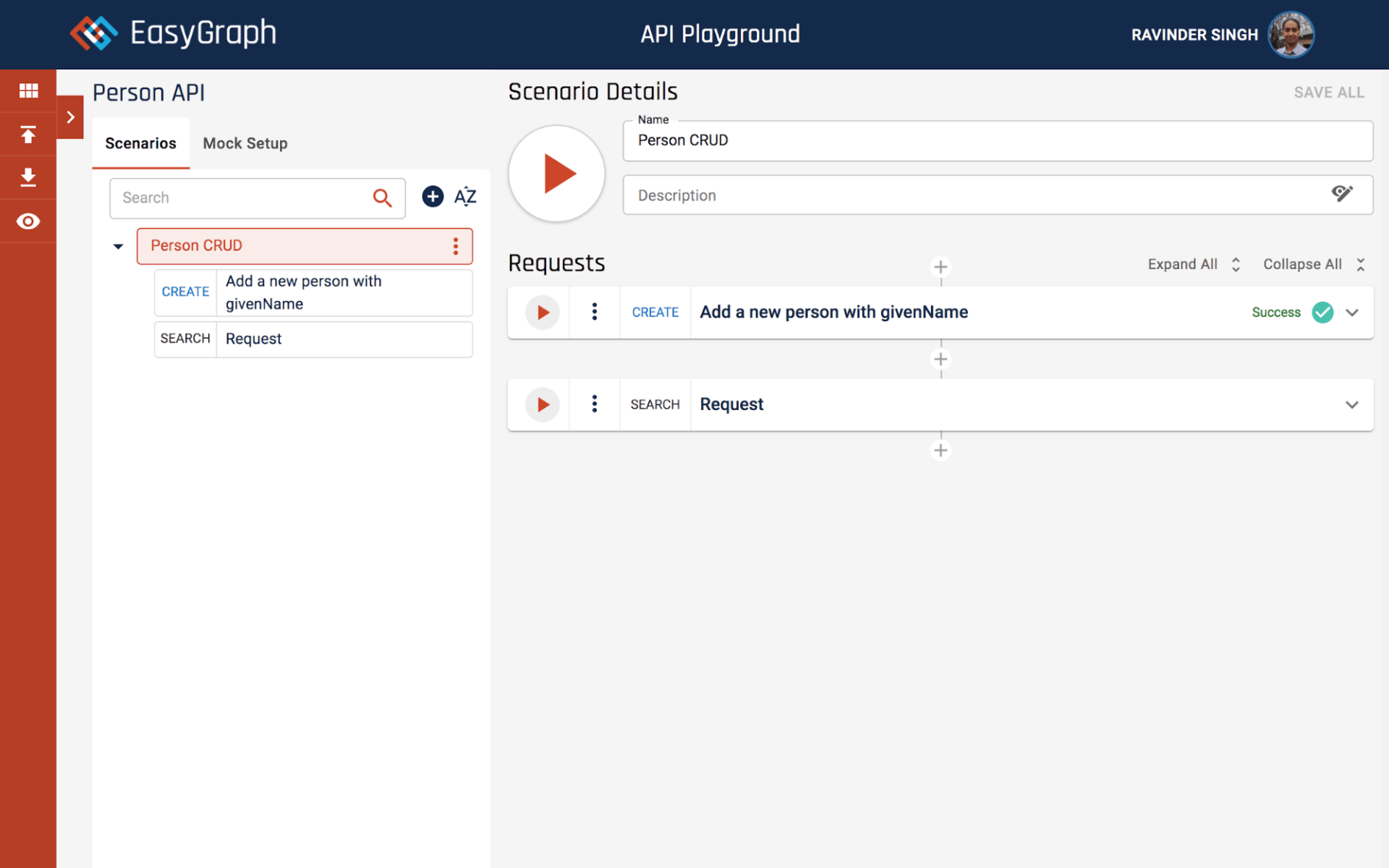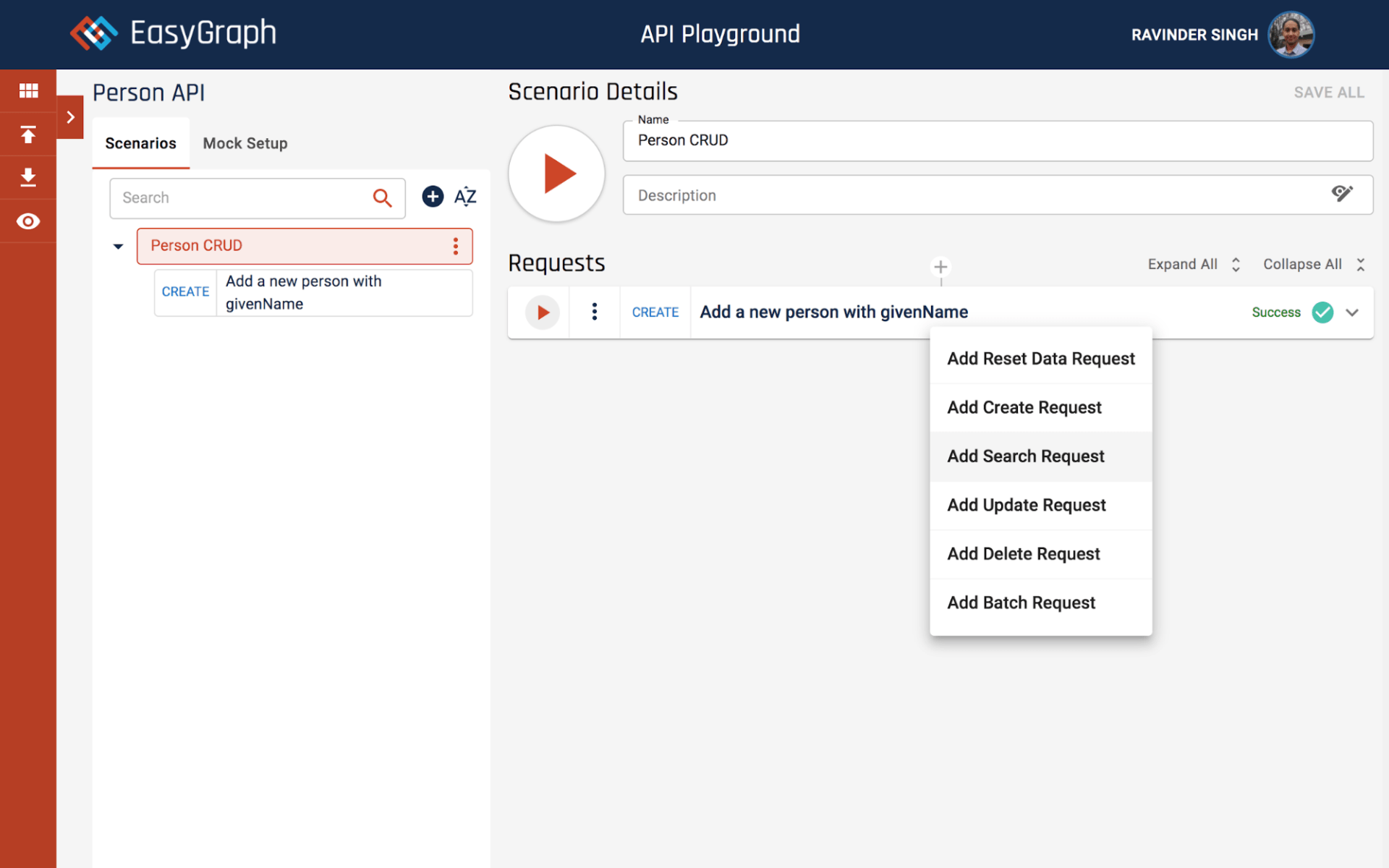 The next feature that we want to try is “Retrieve the list of all persons”. We can do this very quickly using a search request. Click on the Plus button below ‘Add a new person with givenName’ request. This should show the popup menu as below.
