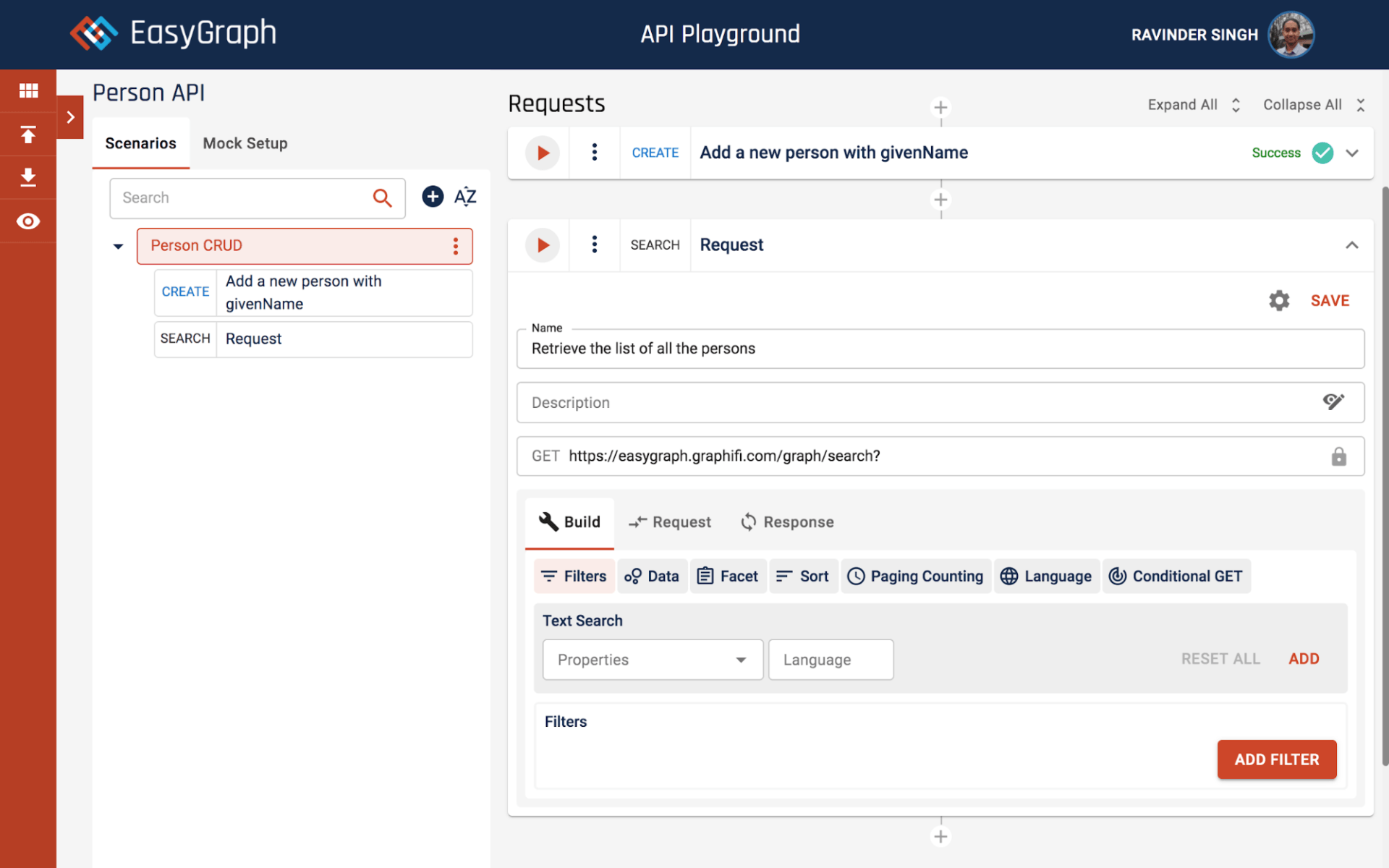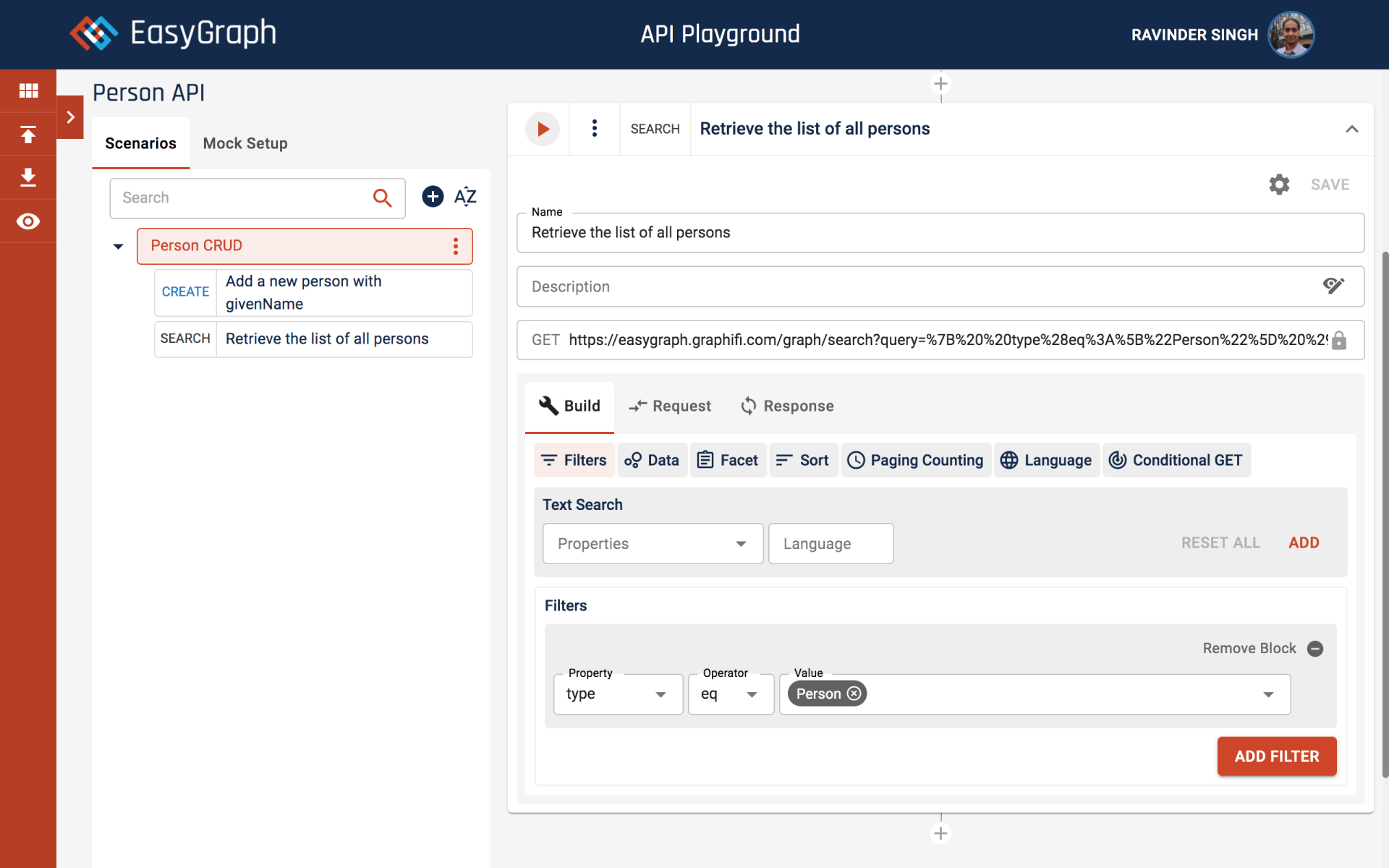 Expand the SEARCH request and enter ‘Retrieve the list of all persons’ in the name field. Under the Build tab click on Filters. Your screen should look as below.