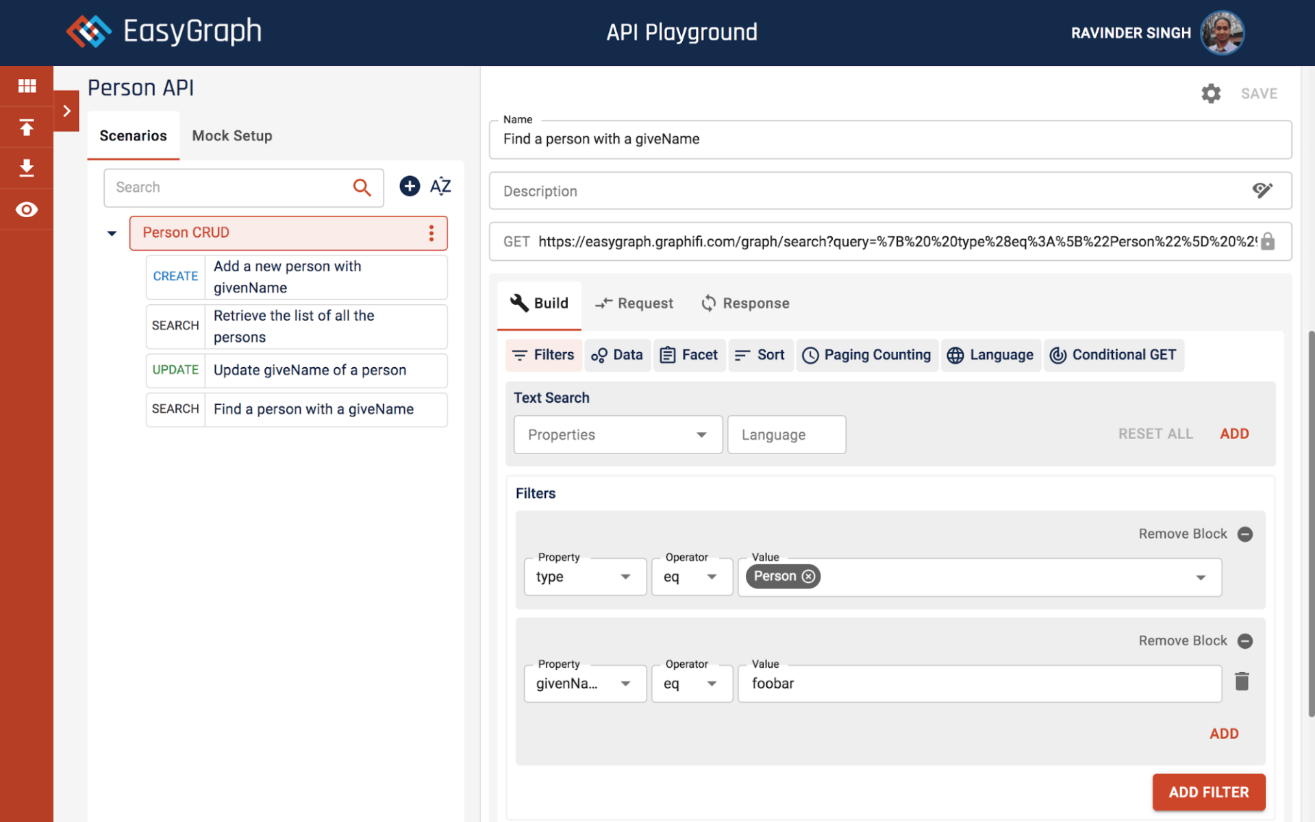Now let us try to find the updated resource by the updated givenName. As explained in previous posts add a new SEARCH request and enter ‘Find a person with a givenName’ in the Name field.