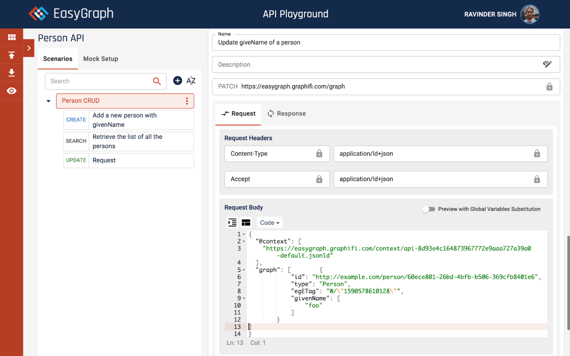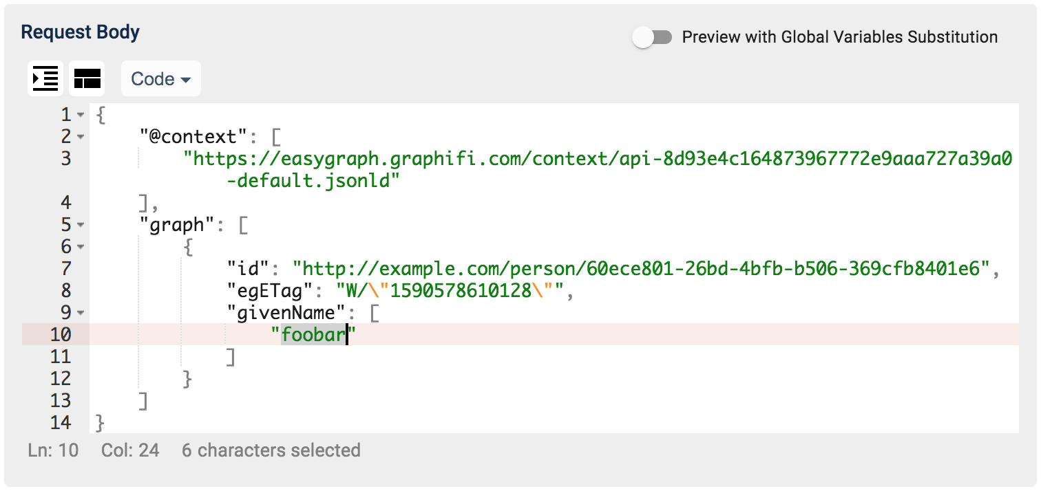 After copying the resource details, paste it into the ‘graph’ property in the ‘Request Body’ section under the Request tab of the UPDATE request. The UPDATE request should look as shown below.