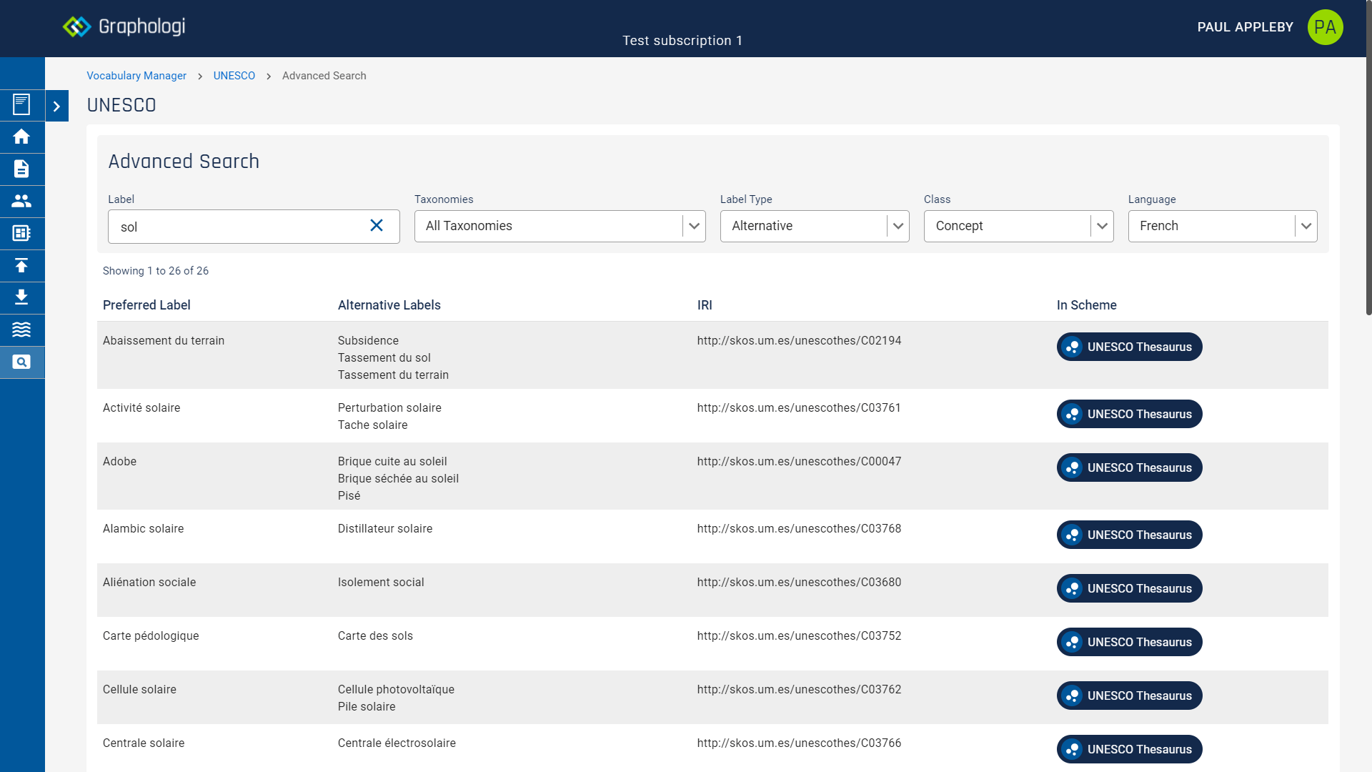 An example of the advanced search is shown in the image below, where the search is looking for the text 'sol' in French within alternative labels of all the taxonomies in the project.