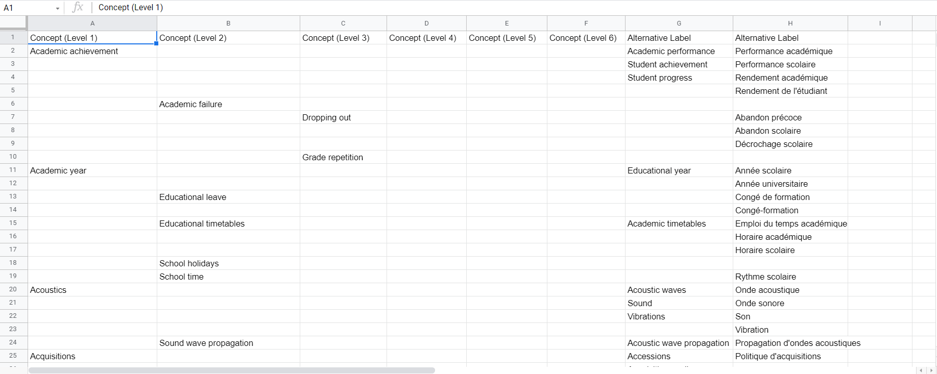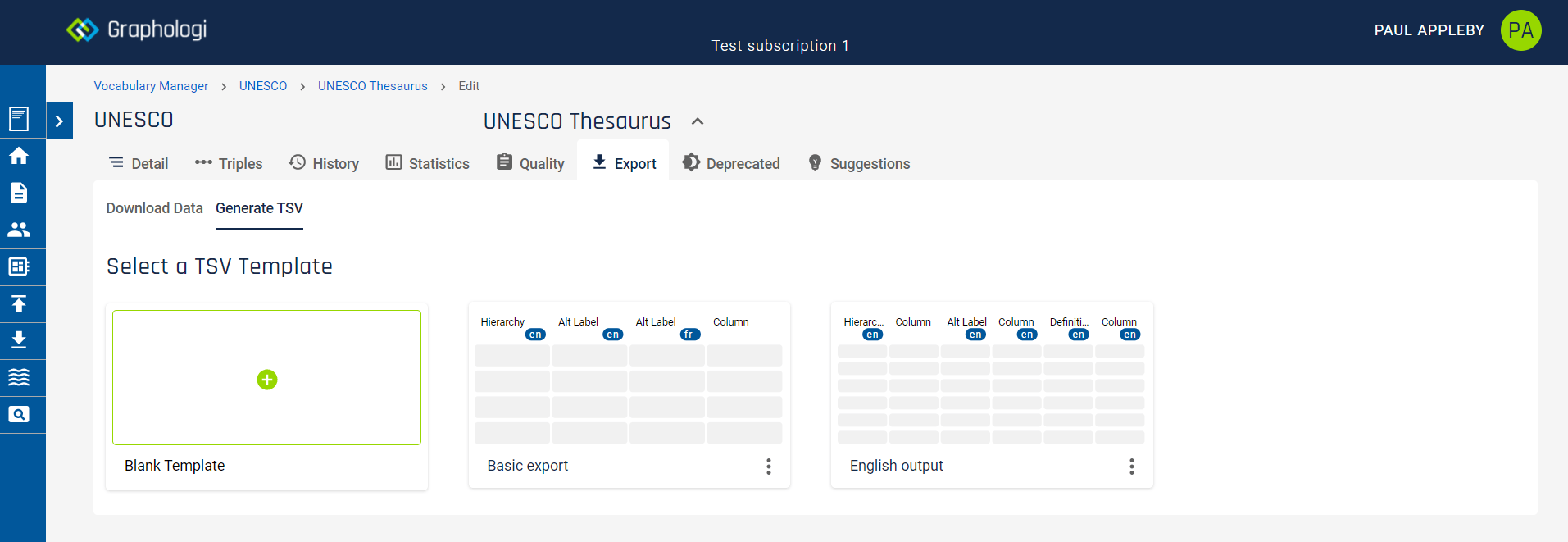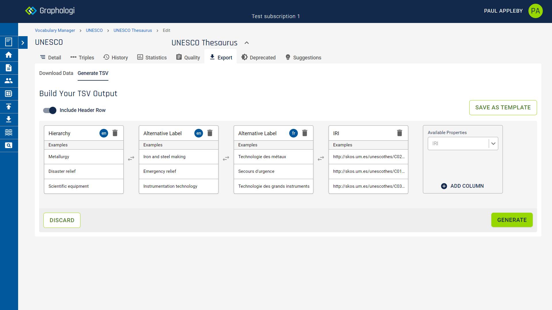 Users can now create customisable exports for taxonomies and collections using the TSV builder, controlling which columns are output and in what order. For instance, you might add a column for alternative labels in English and another in French (as in the example image below). You can also include additional properties that are used from ontologies. You can move columns around, either by switching or dragging them, until you are happy with the setup.
