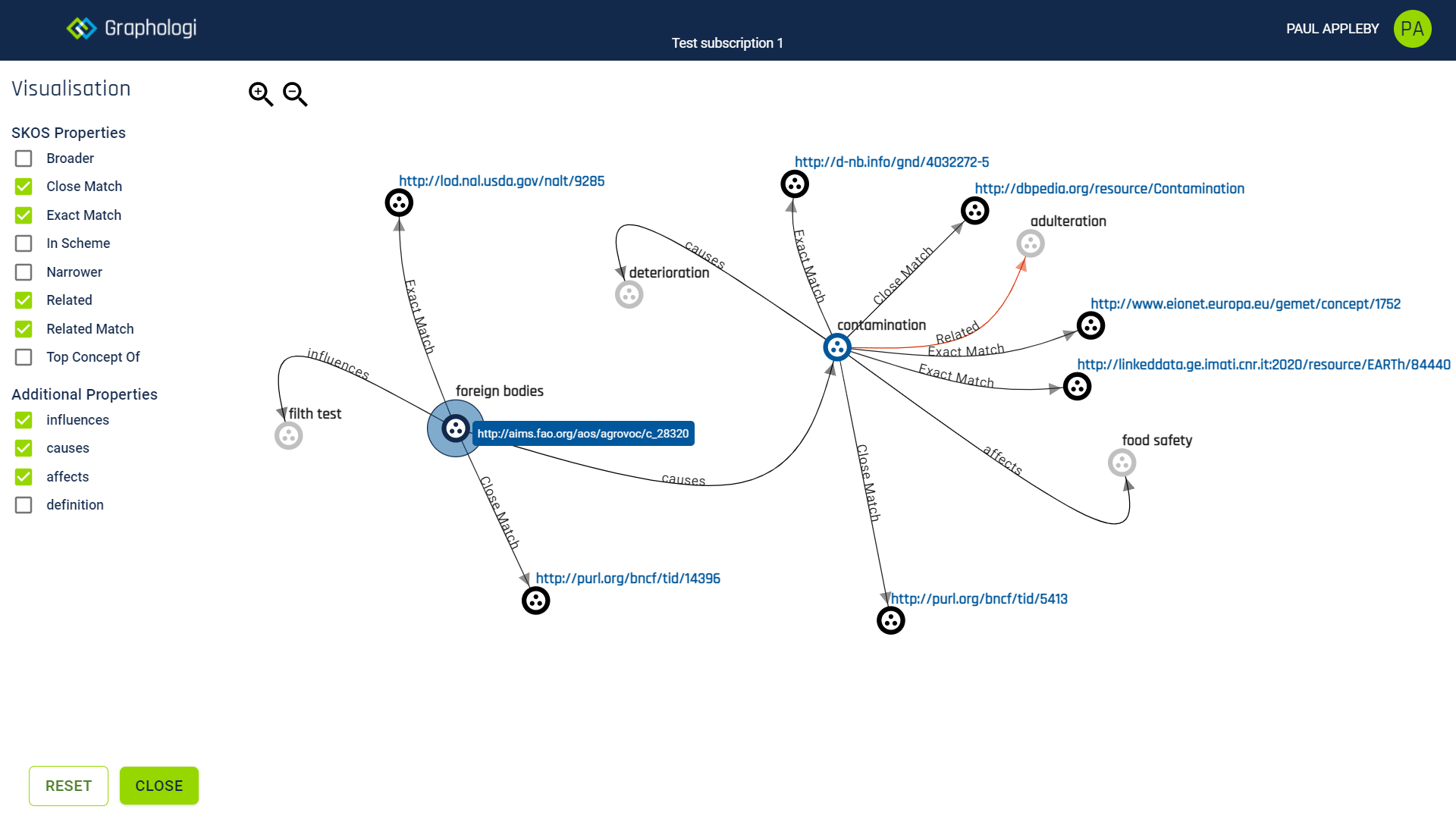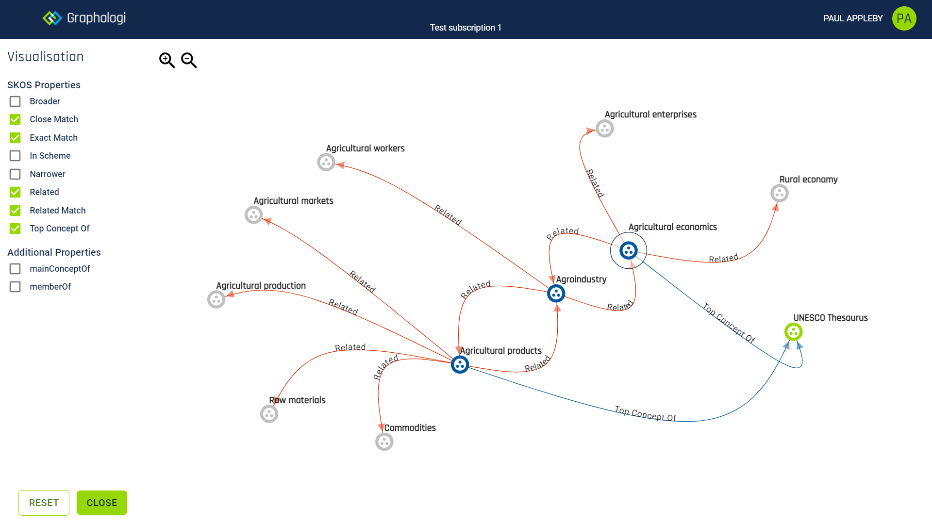 Displaying properties is not limited to the SKOS properties. Any relation can be visualised, including properties included from other ontologies within Graphologi. Another example using Agrovoc is given below, where we can see some of the Agrovoc specific properties being displayed.